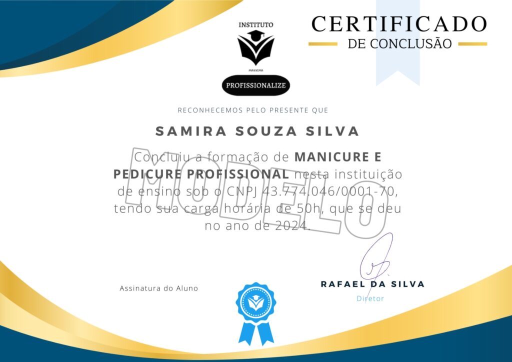 Ao finalizar o curso você receberá do nosso Instituto seu CERTIFICADO DE FORMAÇÃO em Manicure e Pedicure Profissional.